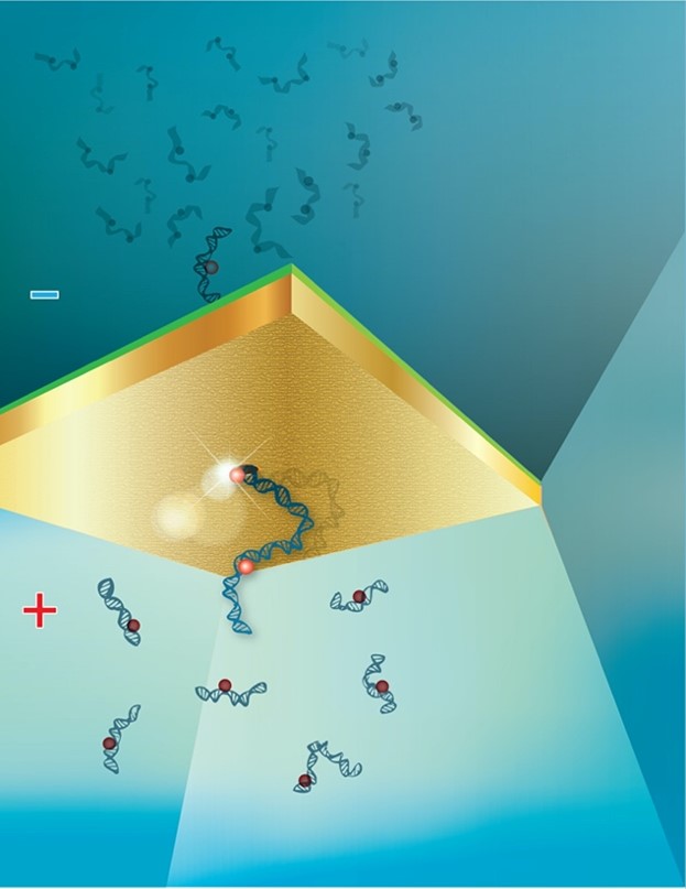איור של מולקולות די-אן-איי כשהן עוברות בזו אחר זו דרך ננו-חריר