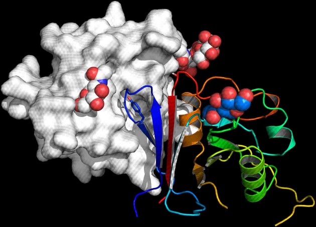 החלק הפעיל של המולקולה "ארנספט" (חוטים בצבעי הקשת) נקשר לקולטן של הנגיף מצ'ופו (באפור). מלכודת דבש